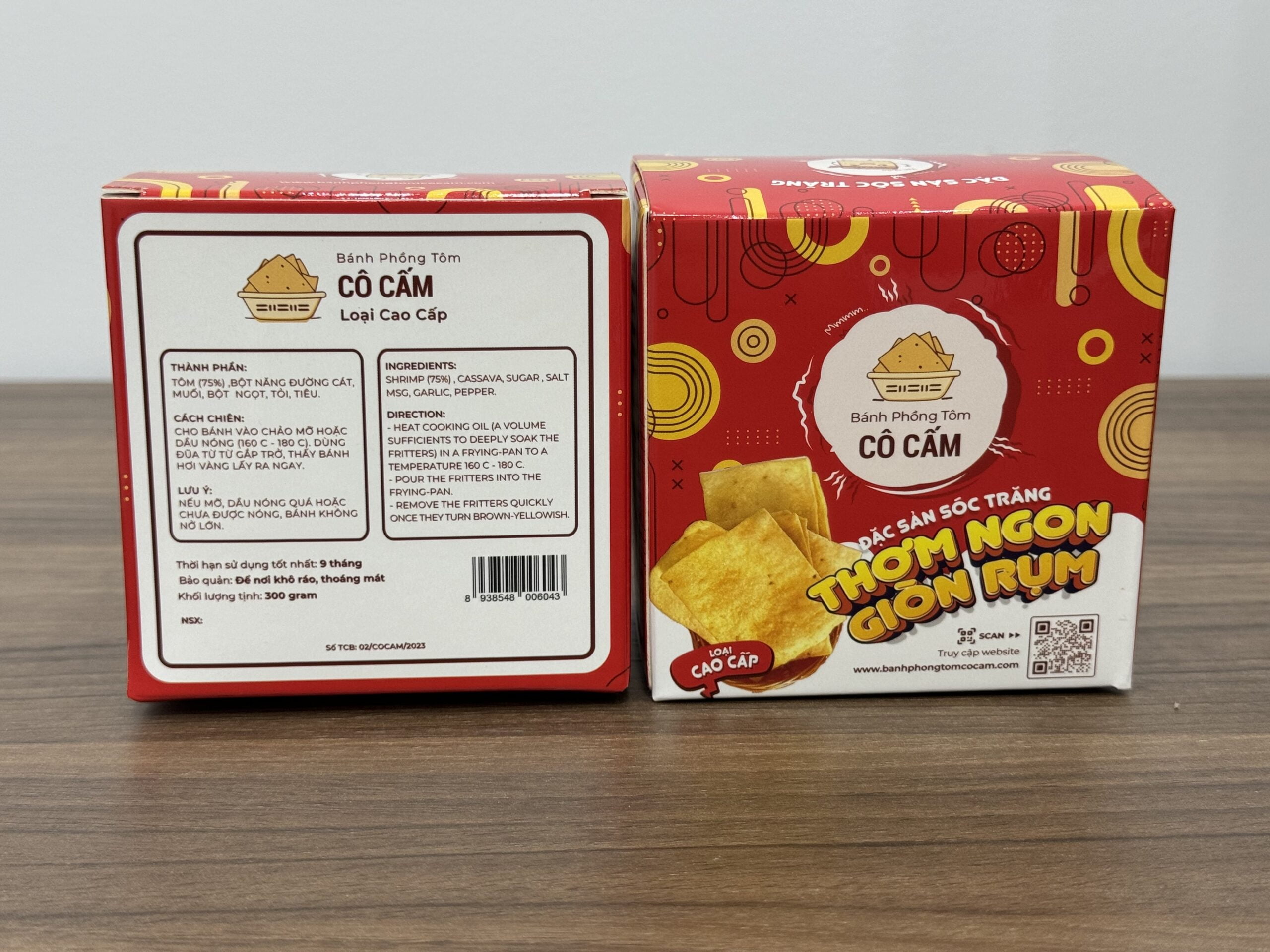 - Bánh phồng tôm Quãng Trân Cô Cấm – Đặc sản Sóc Trăng -Thương hiệu trên 30 năm.Bánh phồng tôm Quãng Trân Cô Cấm Đặc Biệt nhiều tôm, hương vị tuyệt vời. Bánh có hình chữ nhật, có thể chiên với dầu nóng hoặc sấy nóng trong lò vi ba (không cần dầu).Khối lượng đóng gói: 300 gram/hộp